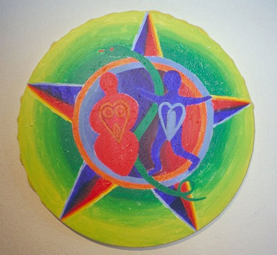 die idee, auf einem runden grund zu malen wurde aus dem wunsch geboren, auf allen seiten die gleiche und natürliche begrenzung zu haben. das runde entspricht auch der erde, unserem lebensraum, den planeten und bildern aus mystischen traditionen (mandalas).